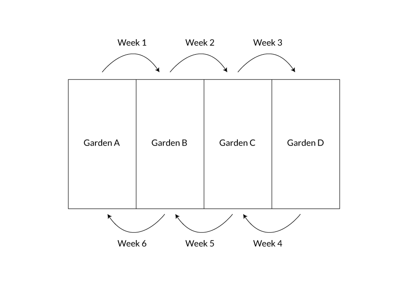 One of the advantages of keeping your own chickens is an opportunity to give them a better life. Chickens who are allowed free range, provides part of their diet through foraging, and will in result be healthier. Their instinct to peck and dig after plants and insects will also mean a natural pest-control and airing of the ground, while their manure acts as an excellent fertiliser. Permaculture offers a great system for chicken ranging by keeping them in moveable pens, on a rotation basis. Once an area has been scratched and dug to the desired level, the chickens are moved to the next patch. Here is an example diagram on how this works: